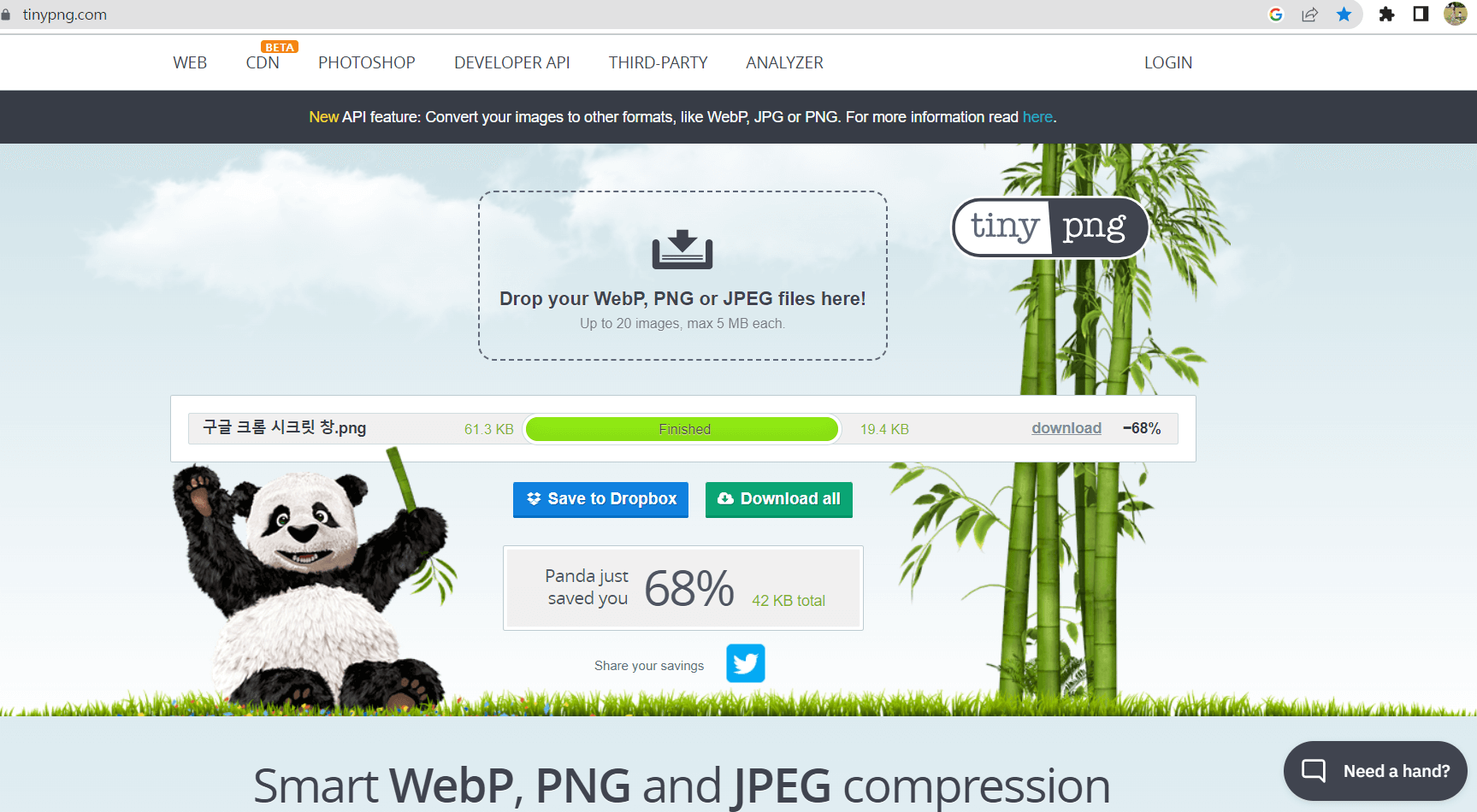 용량을 줄일 사진 파일을 드래그 앤 드롭 기능을 통해서 점선 표기가 된 부분으로 가져다 놓습니다. 그러면 파일이 업로드가 되고 바로 용량을 줄일 수가 있습니다. 하래 화면처럼 성공하면 판다가 만세를 부릅니다. 귀엽네요. 아래 사진의 예시 같은 경우는 원래 61.3kb였는데 작업 이후 19.4kb가 되었습니다. -68%의 용량 절감 효과가 생겼네요. 그렇다고 결과물의 퀄리티가 현저히 떨어지거나 하지 않습니다. 그게 가장 놀라운 점이지요!